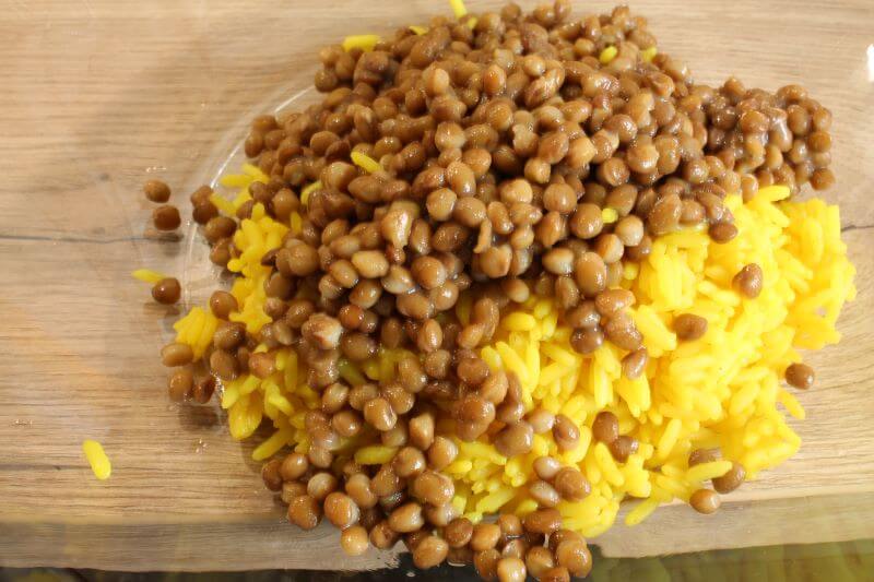 Die Linsen abtropfen und mit dem etwas abgekühlten Reis verkneten.
